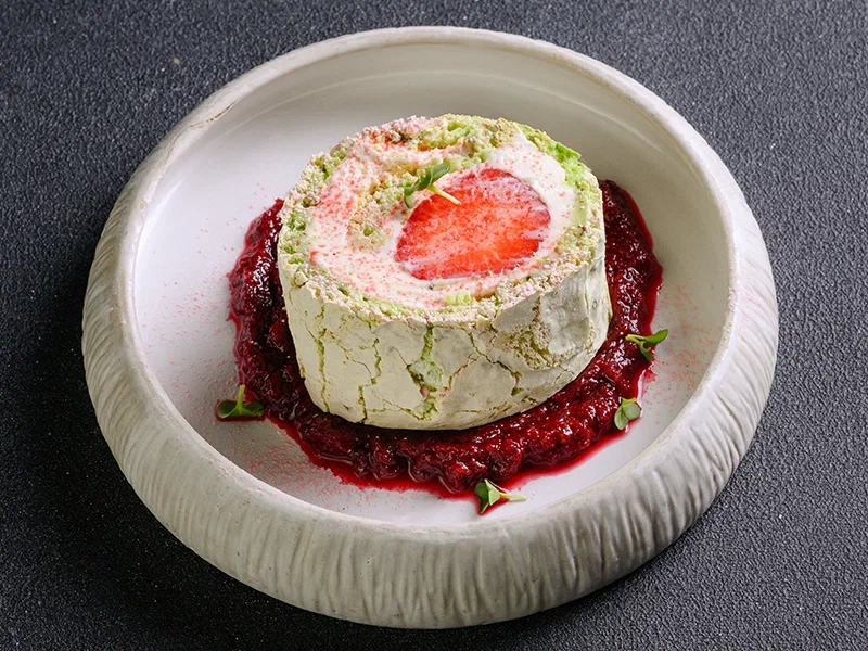 Меренговый рулет с фисташками, сливочный крем, свежая клубника, вишневый соус