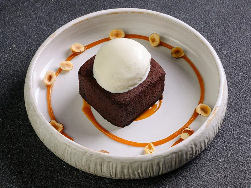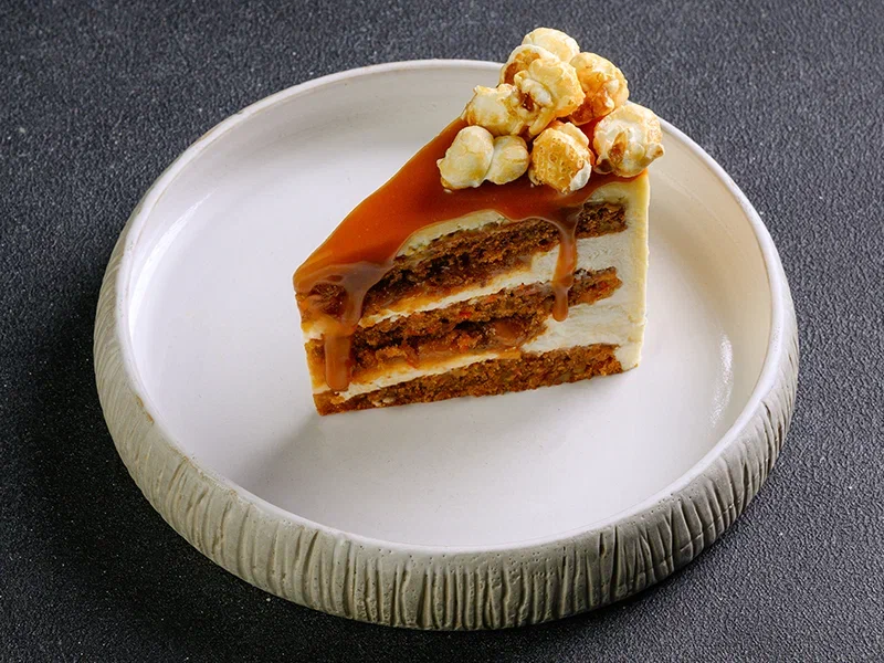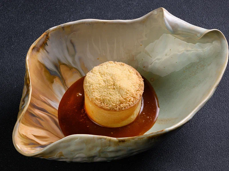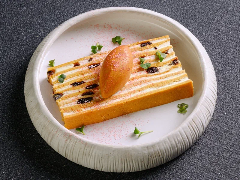 Песочное тесто, рис с изюмом кырт, яйца вареные, песочная крошка, соленая карамель