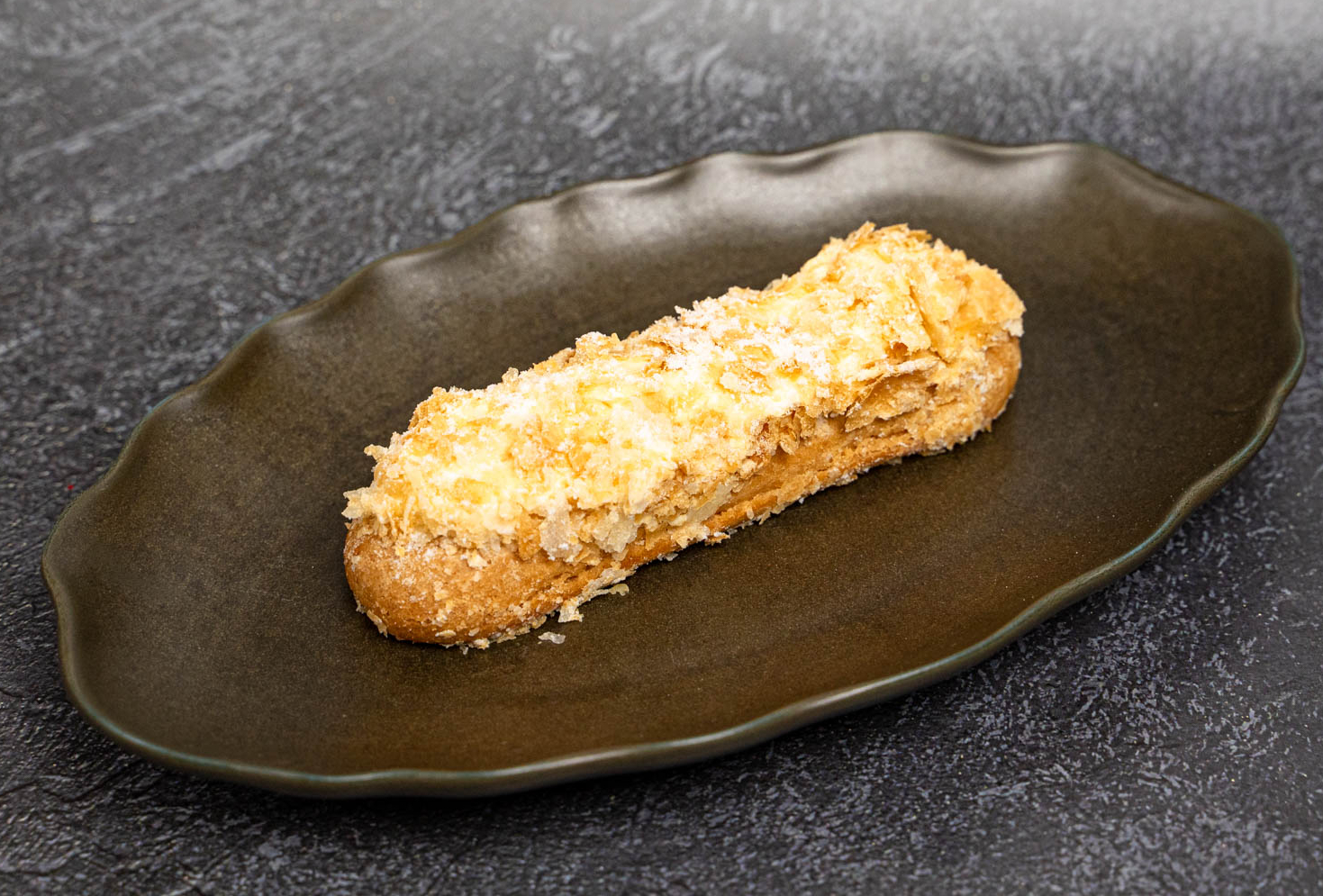 Нежный и пропитанный эклер состоит из воздушного заварного крема и усыпан крошкой хрустящей коржи