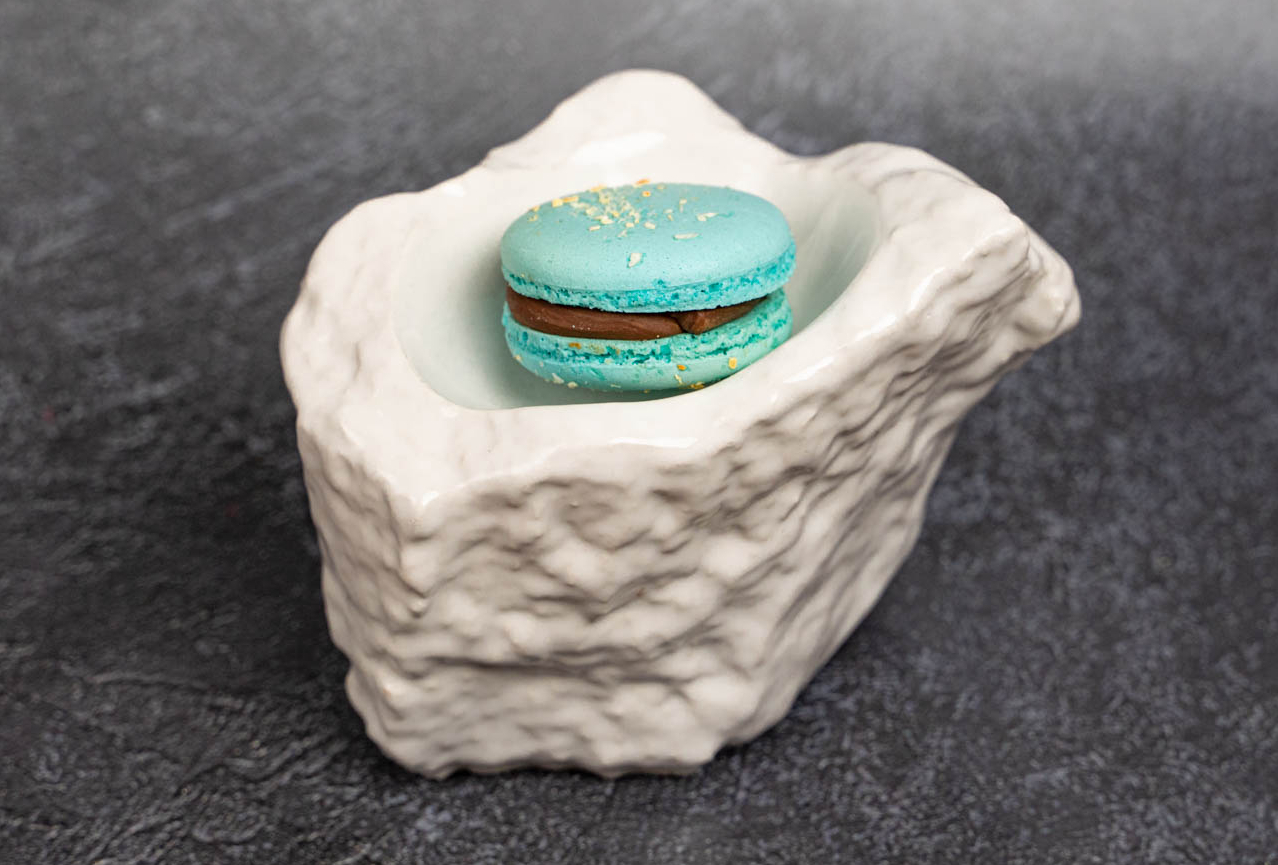 Макарон на миндальной муке, кокосовый ганаш на белом шоколаде из пюре кокоса с добавлением кокосовой стружки, в центре - ганаш на молочном шоколаде, сверху посыпается кокосовой стружкой.