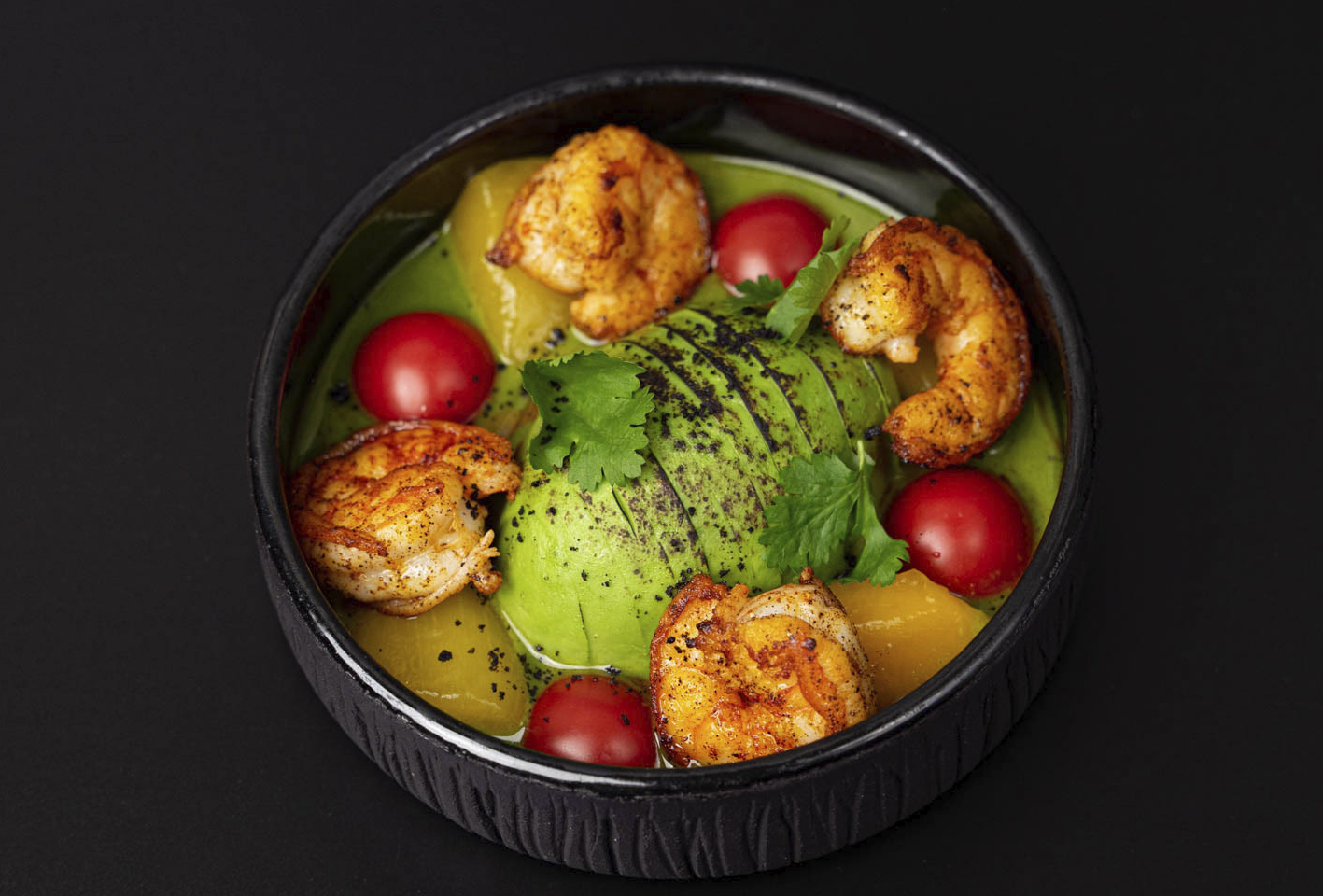 Половинка авокадо обжаривается на гриле, жаренные тигровые креветки и консервированное манго заправляется соусом из кинзы.