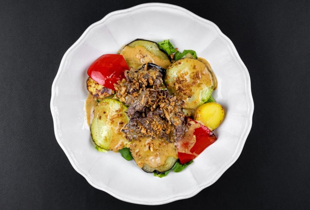 Микс салата ( шпинат, айсберг, руккола ) стейк из телятины, баклажан, цукини, болгарский перец, бэйби картофель, соус ореховый вафу.