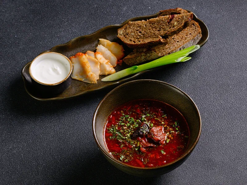 Борщ с черносливом подается с солодовым тартином, конским салом, сметаной и зелёным луком