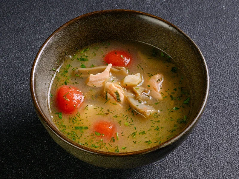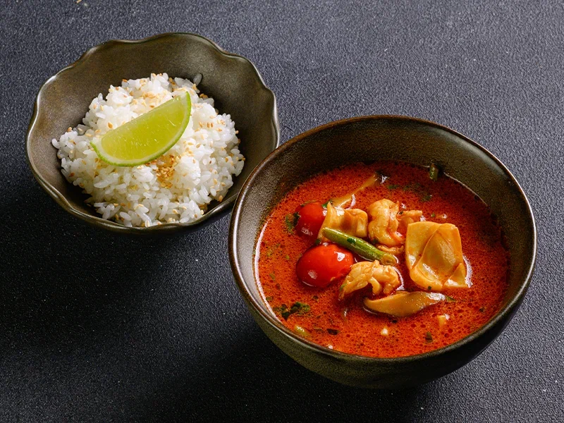 Бульон том ям, кокосовое молоко, кальмар, креветки, черри, шиитаки, рис, лист лайма, кинза