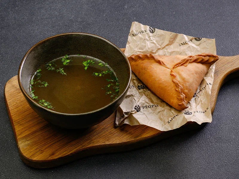 Треугольник – это традиционное татарское и башкирское блюдо, печёный пирожок треугольной формы из дрожжевого или пресного теста с сочной начинкой из рубленого мяса, картофеля и лука. Подается вместе с говяжьим бульоном