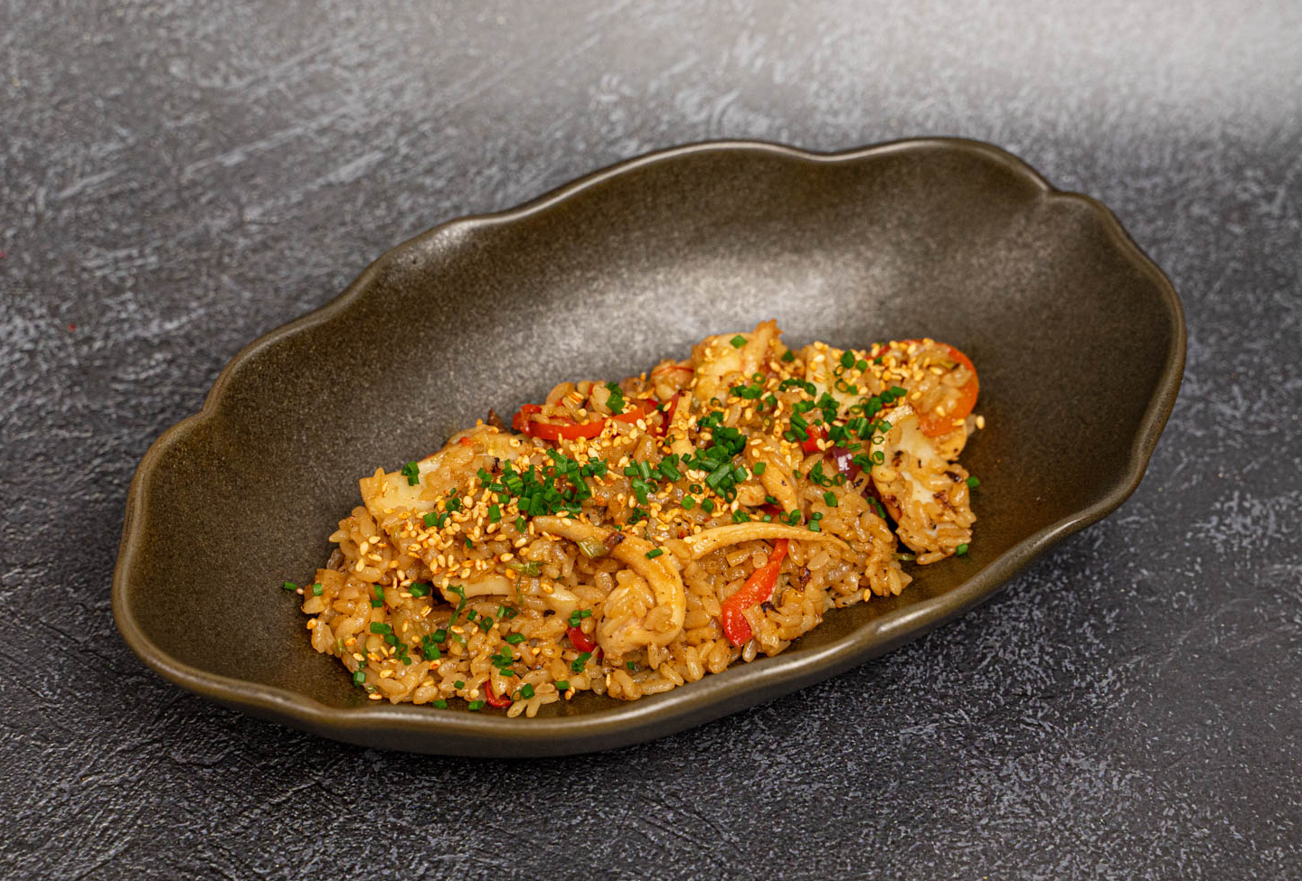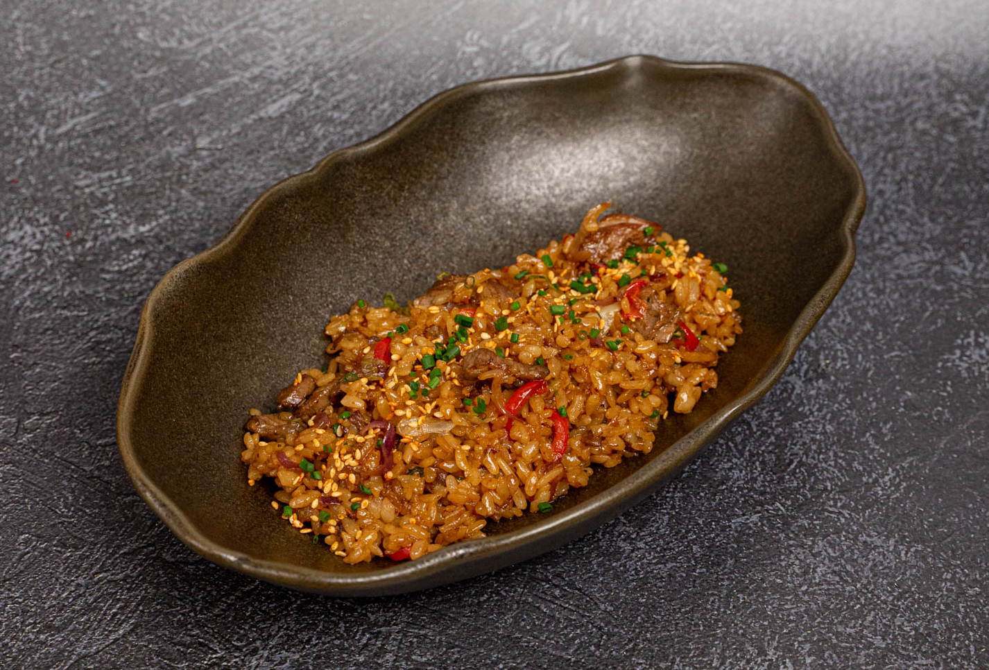 Блюдо готовят из специального риса для суши. Болгарский перец, чеснок, имбирь маринованный, салат айсберг,лук красный обжариваются с соусом унаги, устричным соусом на растительном и кунжутном масле.Украшается луком сибулетом и кунжутом кимчи.