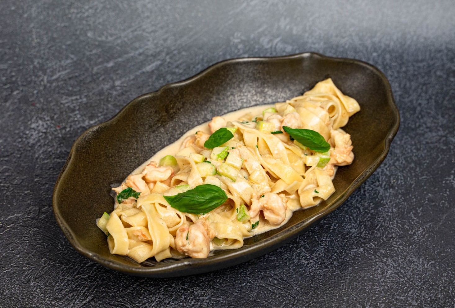 Паста Паппарделле, сливочный перечный соус со стейком из телятины, грибы вешенки и копчёный сыр сулугуни. Паппарделле, сливочный перечный соус со стейком из телятины, грибы вешенки и копчёный сыр сулугуни