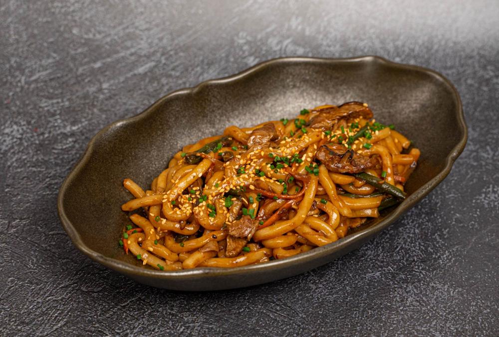 Лапша удон приготовленная с телятиной и обжаренная с вешенками и свежими овощами (морковь, фасоль, красный лук) под соусом унаги и кимчи.Сверху посыпается кунжут кимчи и лук сибулет.